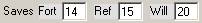 Three text boxes hold the saving throw bonuses for Fortitude, Reflex and Will saves. These values can be edited and also change automatically if the relevant ability score is modified. Double-click the label to roll that saving throw. The save has a pale green background if a condition affects it positively; a pale red background if the modifier is negative; and the normal background if no condition affects the save.