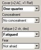 Four dropdown lists allow you to set the cover, concealment, fatigue and/or fear of any creature. These conditions do not normally automatically expire, but if you wish, use the Condition Setter to set expiration for these conditions. The label above the list summarizes the game effect.