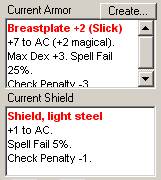 The two textboxes show the current armor and shield that the creature is using. To equip a shield or armor, select it in the dropdown box at right and click "Add". Make sure the armor you wish to use is equipped (right-click and check the "Equipped" menu). Equipped items are in bold.