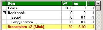 Below the list of items is the total weight and value of all the items in the list. Multiple items' weights and prices are multiplied – for example 20 arrows at 1 cp and 0.01 lb each are worth 2 sp and weigh 0.2 lbs. Total Weight also includes weight from coins (50 coins/pound).