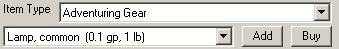 The Add button will get the item for free, while the Buy button will subtract the correct amount of money from the total. Note that the buy button won't make change for you – if you buy a 1 cp item but have only silver pieces, you will end up with –1 cp.