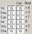 - Next is the current ability score. This is different from the base score if the creature is affect by spells, magic items, temporary ability damage, or fatigue (see Conditions Frame ). You can also edit this number manually. When the score has been improved, its background is light green, and when it's been reduced, its background is light red.