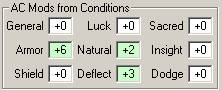 Different spells provide different types of bonuses to AC. The total bonus or penalty for each of these types is displayed in this frame. Bonuses of different types always stack, while bonuses of the same type usually do not stack (except dodge, and general). To viewThis frame may not be visible if you are running DM Genie at 800x600. Positive AC modifiers are signaled with a pale green background, while negative AC modifiers have a pale red background.